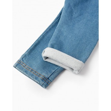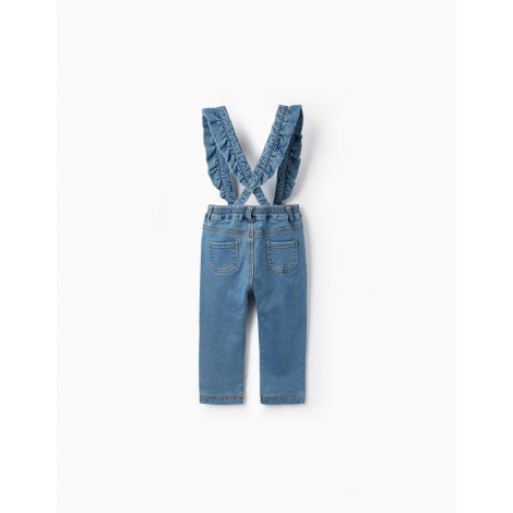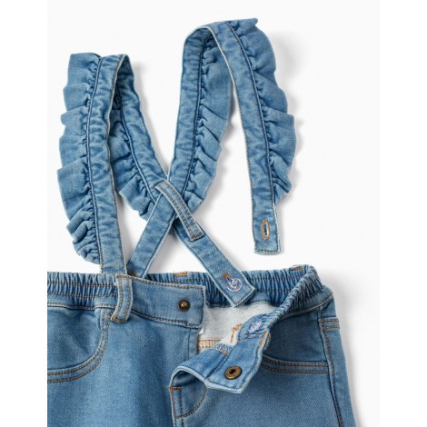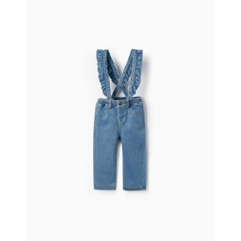 Jeans denim blu per neonata, realizzati in denim di cotone con un tocco di elastan per maggiore comfort e libertà di movimento. Spalline removibili con finitura a volant ondulato. Due tasche decorative sul davanti e due funzionali sul retro. Modello slim fit con elastico in vita. Cuciture a contrasto. Un capo della collezione Comfort Denim, pensato per offrire il massimo comfort e libertà di movimento al bambino. Big Me: si chiude con un bottone a pressione sotto un bottone decorativo fino alla taglia 5/6, per facilitare la vestizione e favorire l'autonomia del bambino.
