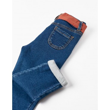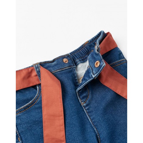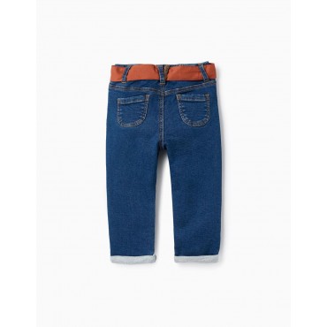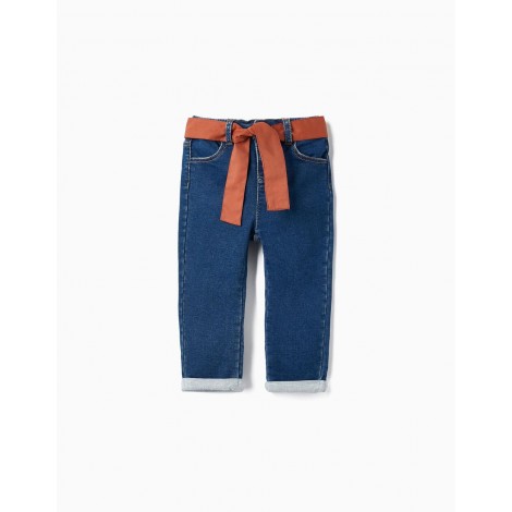 Jeans denim blu per neonata, realizzati in denim di cotone con un tocco di elastan per maggiore comfort e libertà di movimento. Con un nastro marrone che funge da cintura da annodare sul davanti e aggiungere un tocco di colore. Quattro tasche. Modello slim fit con elastico in vita. Cuciture e pieghe in contrasto sugli orli. Un capo della collezione Comfort Denim, pensato per offrire il massimo comfort e libertà di movimento al bambino. Big Me: si chiude con un bottone a pressione sotto un bottone decorativo fino alla taglia 5/6, per facilitare la vestizione e favorire l'autonomia del bambino.