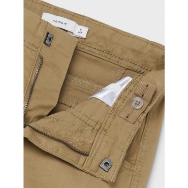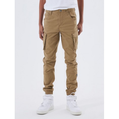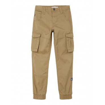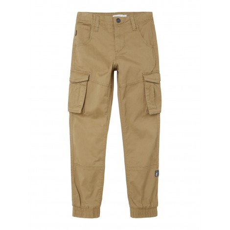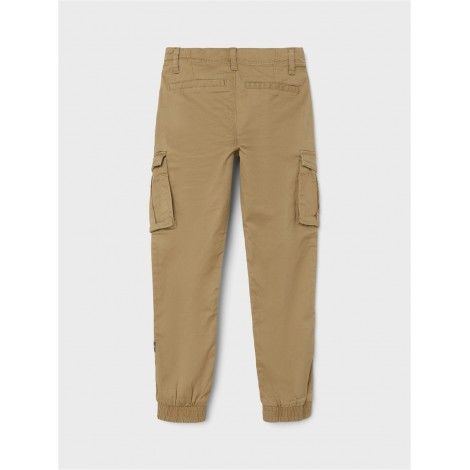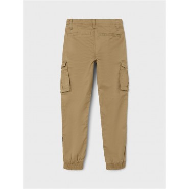 Pantaloni bambino/ragazzo Name it beige modello cargo, con polsini elastici, apertura con bottone a gancio e zip, elastico regola vita interno, tasconi ai lati