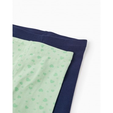 Set di due paia di leggings per neonata, realizzati in cotone con un tocco di elastan per maggiore comfort e libertà di movimento. Un paio di leggings blu scuro a tinta unita e un paio di leggings verdi con un motivo di cuori e fiori in verde scuro. Cintura elastica. We Care: articolo con certificazione Oeko-Tex Standard 100, che garantisce l'assenza di sostanze nocive o irritanti per la pelle.