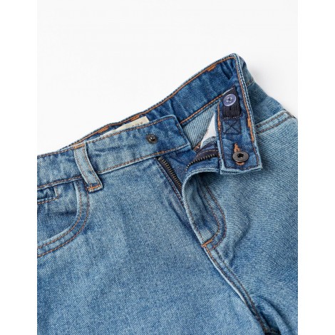 Jeans per bambina, in denim 100% cotone. Taglio stile gamba ampia. Cinque tasche. Vita con elastici e bottoni regolabili all'interno. Si chiude sul davanti con zip e bottone a pressione. Orli con effetto filo sfrangiato. Big Me: si chiude con un bottone a pressione sotto un bottone decorativo fino alla taglia 8/9, per facilitare la vestizione e favorire l'autonomia del bambino.