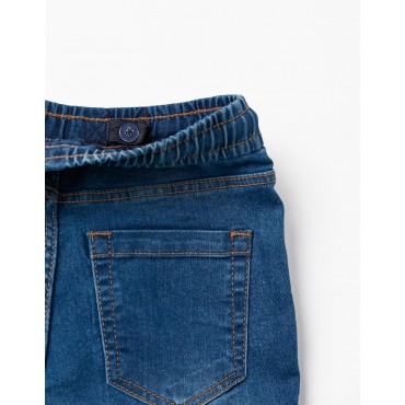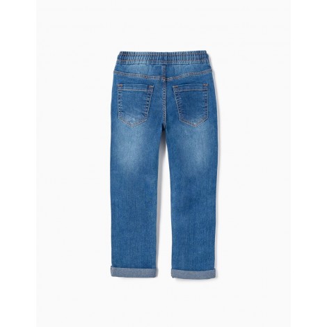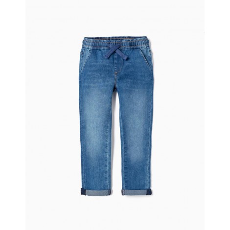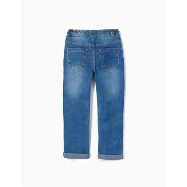 Jeans in denim blu per ragazzi, realizzati in denim misto cotone con un tocco di elasticità per maggiore comfort e libertà di movimento. Modello sportivo e dalla vestibilità slim. Vita elastica regolabile all'interno e coulisse regolabile all'esterno in contrasto. Quattro tasche. Orli risvoltati con cuciture in contrasto. La versatilità dei jeans denim con la comodità dei joggers in un unico pezzo.