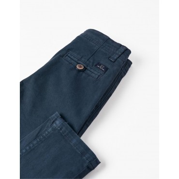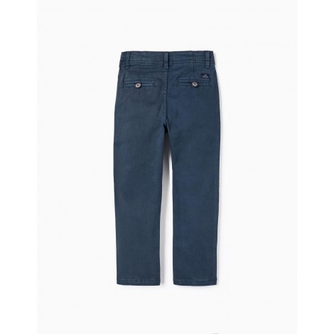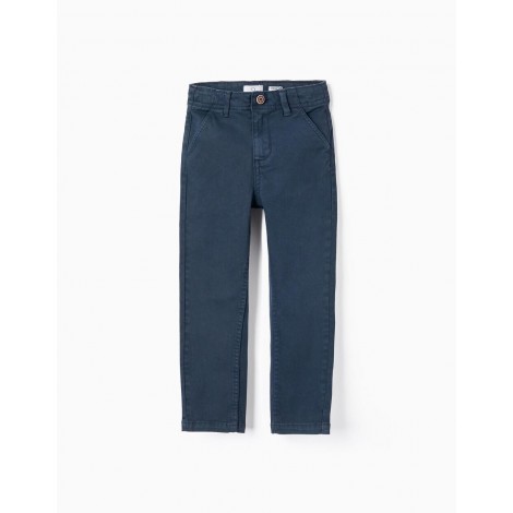 Pantaloni blu scuro per bambino, in twill di cotone con un tocco di stretch per maggiore comfort e libertà di movimento. Modello dalla vestibilità slim. Quattro tasche. Vita regolabile internamente con elastico e bottoni. Si chiude con un bottone a pressione per vestirsi facilmente. Tinto in capo. Intramontabili, questi pantaloni sono adatti sia per look casual che per uno stile più tradizionale. Big Me: si chiude con un bottone a pressione sotto un bottone decorativo fino alla taglia 5/6, per facilitare la vestizione e favorire l'autonomia del bambino