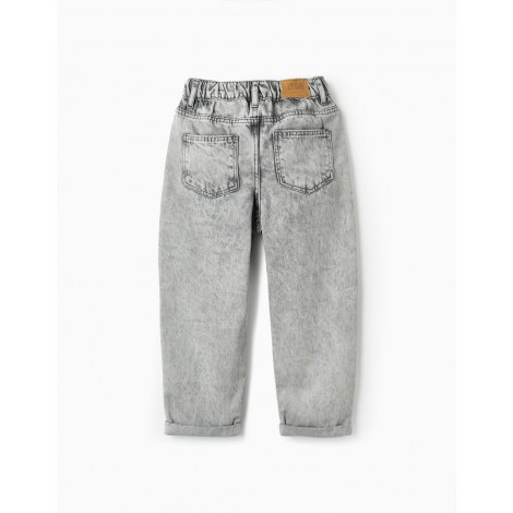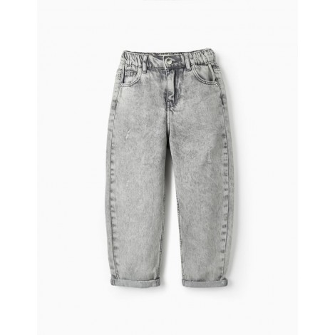 Pantaloni in denim grigio per bambina, realizzati al 100% in cotone. Dettaglio di piccoli strappi sul davanti per un tocco trendy. Vita elastica e regolabile all'interno con bottoni ed elastici. Si chiude con cerniera e bottone a pressione per indossarlo facilmente. Cinque tasche. Taglio in stile "Mom Fit". Orli pieghevoli. Modello aderente. Big Me: si chiude con un bottone a pressione sotto un bottone decorativo fino alla taglia 8/9, per vestirsi facilmente e favorire l'autonomia del bambino.