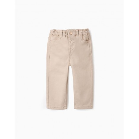 Pantaloni paperbag beige per neonate, in twill di cotone con un tocco di stretch per maggiore comfort e libertà di movimento. Cinque tasche. Vita elastica, regolabile all'interno con elastici e bottoni. Si chiude facilmente con un bottone automatico. Per look eleganti e comodi.