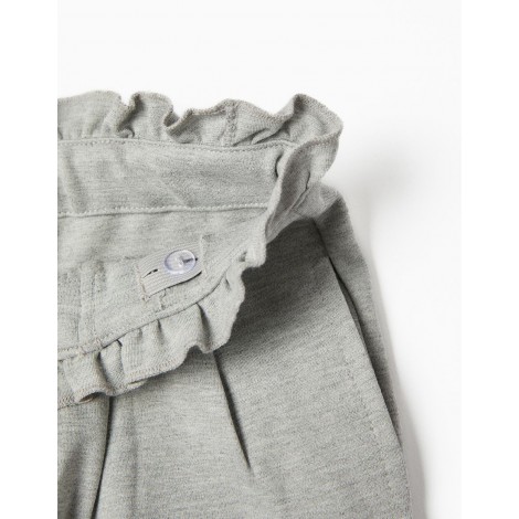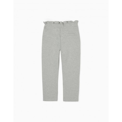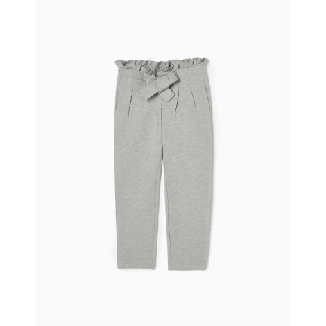 Pantaloni grigi per ragazze, realizzati in jersey spesso con stretch per un maggiore comfort e libertà di movimento. Cintura pizzicata, stile paperbag, con cinghie integrate da annodare sul davanti. Regolabile internamente con elastici e bottoni. Taglio regolare. Tasche funzionali sui fianchi e una decorativa sul retro. Un pantalone versatile, pratico e comodo, per ogni occasione.