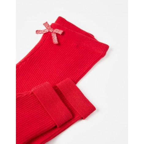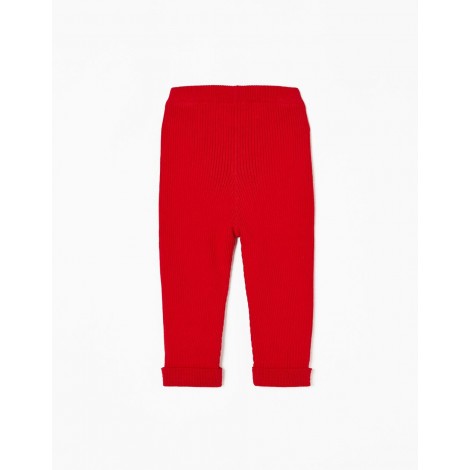 Pantaloni rossi per neonate realizzati in maglia a coste, che offre grande comfort e intimità. Vita elasticizzata e fiocco decorativo con fili di lurex argento. Orli con risvolto decorativo. Un pantalone flessibile e comodo da indossare sia a casa che in giro