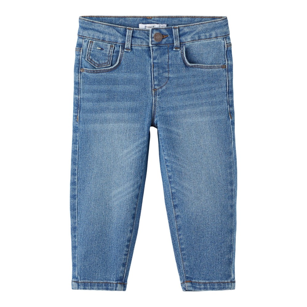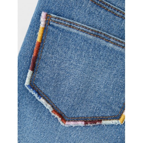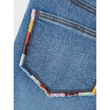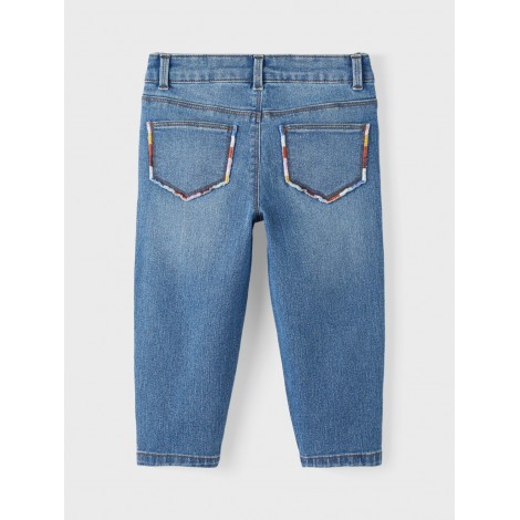Jeans bambina Name it modello baggy, regola vita interno, chiusura con bottone e zip, dettaglio colori sulla taschina sul retro