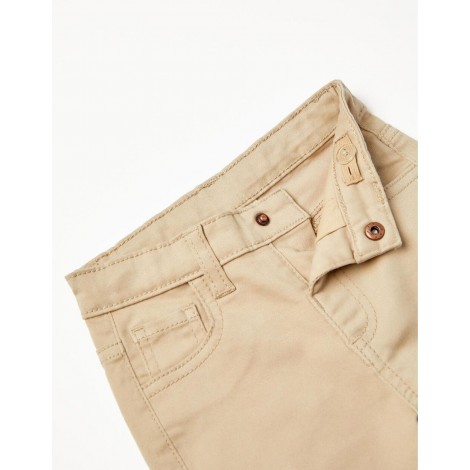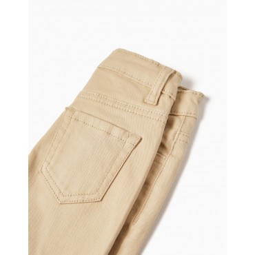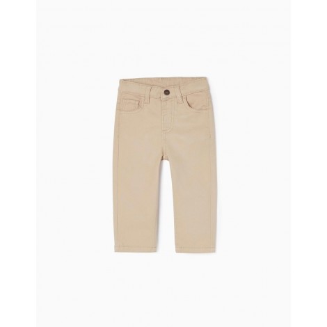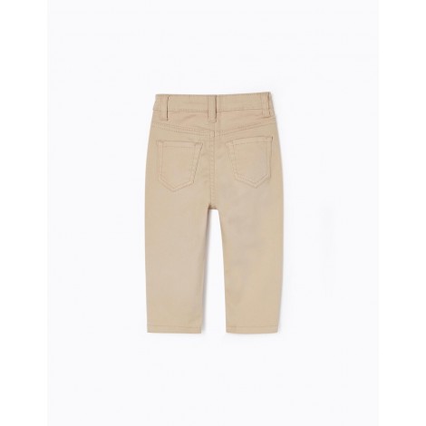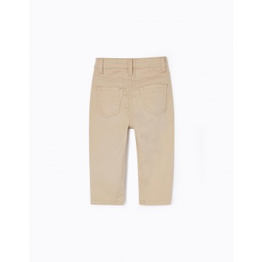 Pantalone beige per neonato, in twill di cotone con un tocco di stretch per una maggiore comodità e libertà di movimento. Si chiude con un bottone automatico per una facile vestizione. Vita interna regolabile con elastici e bottoni. Cinque tasche. Un pantalone comodo e senza tempo, della collezione Mix&Match, che permette infinite combinazioni di pezzi e look.