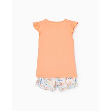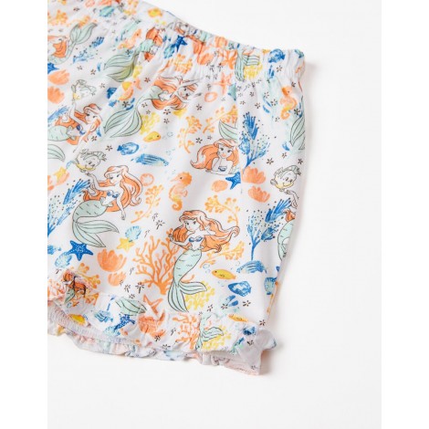 Pigiama Disney per bambina composto da t-shirt e pantaloncini. 100% cotone. T-shirt smanicata color corallo con volant sulle spalle, fiocco sul collo e stampa frontale della Sirenetta. Shorts bianchi con motivo e balze sugli orli. Etichette stampate all'interno per non irritare la pelle. Pigiami leggeri e comodi per le notti primaverili/estive. Le ragazze fan di Ariel lo adoreranno!