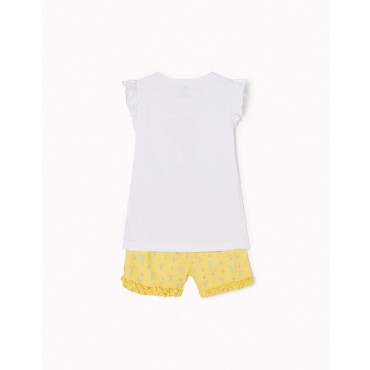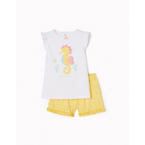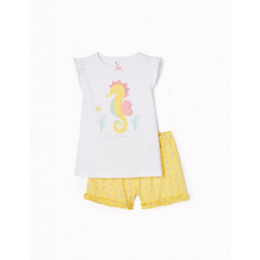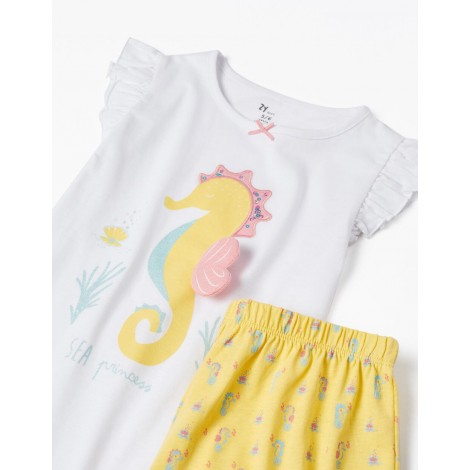 Pigiama due pezzi per bambina, 100% cotone. T-shirt bianca senza maniche con stampa frontale di un adorabile cavalluccio marino con glitter, paillettes e pinna 3D. Foglioline sulle spalle e fiocco decorativo sul collo. Chiusure a scatto sulla spalla per vestirsi facilmente. Shorts gialli con fantasia e balze sull'orlo. Etichette interne stampate in modo da non irritare la pelle. Morbidi, comodi e adorabili, questi pigiami rallegreranno sicuramente i bambini prima di coricarsi.