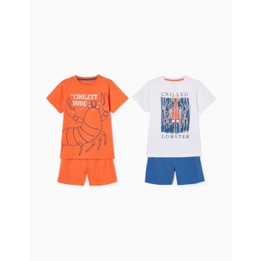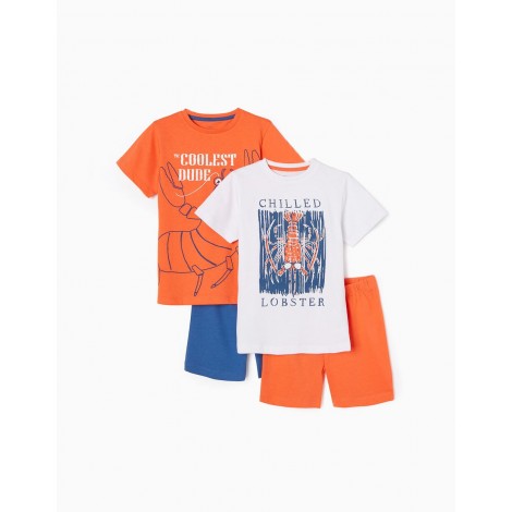 Confezione da due pigiami per bambino, 100% cotone, nei toni del bianco, arancio e blu, con divertenti illustrazioni di aragosta. Include due magliette a maniche corte e due pantaloncini con elastico in vita per vestirsi facilmente. Etichette interne stampate per non irritare la pelle. Un set pratico e confortevole della collezione Mix & Match, i cui pezzi possono essere combinati tra loro.