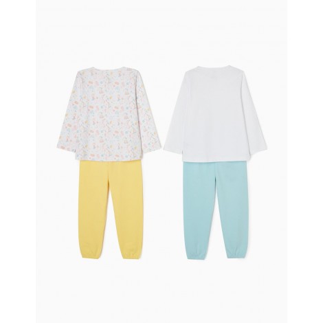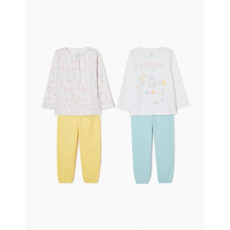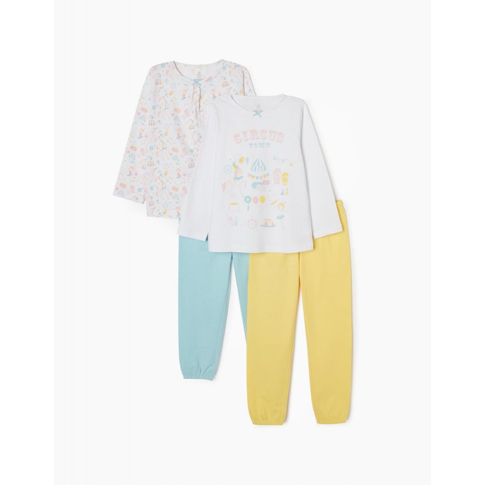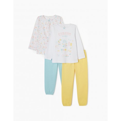 Set di due pigiami per bambina, 100% cotone. Include due magliette bianche a maniche lunghe e due paia di pantaloni. Una T-shirt con stampa frontale e una con motivo circense multicolor. Collo tondo con fiocco decorativo. Due paia di pantaloni semplici con elastico in vita e al fondo, uno giallo e uno azzurro. Etichette interne stampate per non irritare la pelle. La confezione comprende quattro diversi pezzi che possono essere combinati creando più pigiami.
