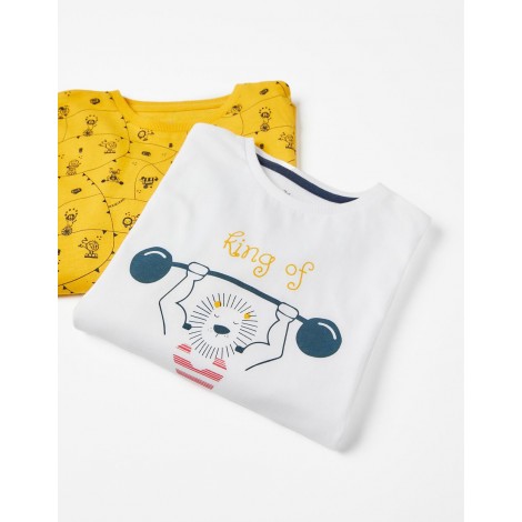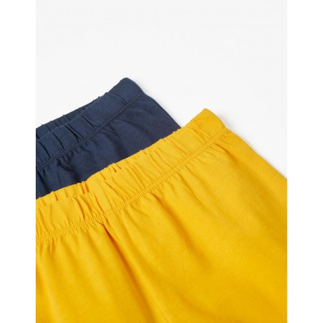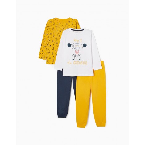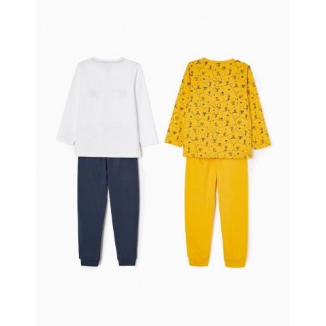 Confezione da due pigiami per bambino, nei toni del blu, bianco e giallo. Realizzata in jersey di cotone 100%. Include due t-shirt a maniche lunghe e due paia di pantaloni. Una t-shirt con stampa frontale, una con motivo stampato e due paia di pantaloni semplici con elastico in vita e fondo aderente. Collo a costine per una facile vestizione ed etichette interne stampate per non irritare la pelle. Una confezione pratica e simpatica, con l'etichetta Mix&Match, che permette di combinare i pezzi tra loro, creando pigiami diversi.