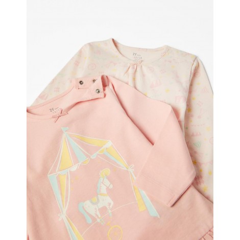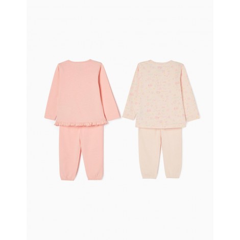 Confezione da due pigiami per neonata, nei toni del rosa. Realizzata in 100% cotone Interlock. Include due t-shirt a maniche lunghe e due paia di pantaloni. Una t-shirt con stampa frontale e con balze sul fondo, e una con fantasia, entrambe con automatici sulla spalla per una facile vestizione. Due paia di pantaloni semplici con vita e fondo elasticizzati per una vestibilità perfetta. Etichette interne stampate per non irritare la pelle. Una confezione pratica e simpatica, con l'etichetta Mix&Match, che permette di combinare i pezzi tra loro, creando pigiami diversi.