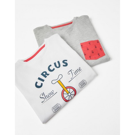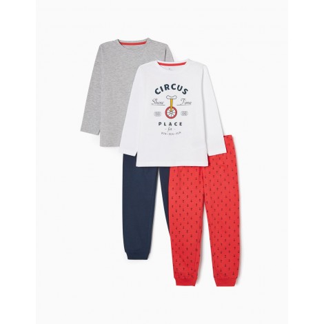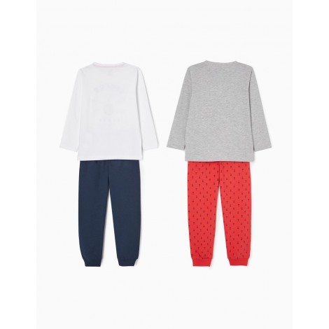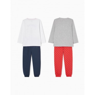 Confezione da due pigiami per bambino, nei toni del grigio, rosso, blu scuro e bianco. Realizzata in jersey di cotone 100%. Include due t-shirt a maniche lunghe e due paia di pantaloni. Una T-shirt con stampa frontale e una con taschino; un paio di pantaloni semplici e uno con fantasia stampata, entrambi con elastico in vita e fondo aderente. Collo a costine per una facile vestizione ed etichette interne stampate per non irritare la pelle. Una confezione pratica e simpatica, con l'etichetta Mix&Match, che permette di combinare i pezzi tra loro, creando pigiami diversi