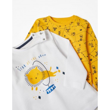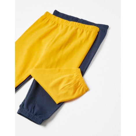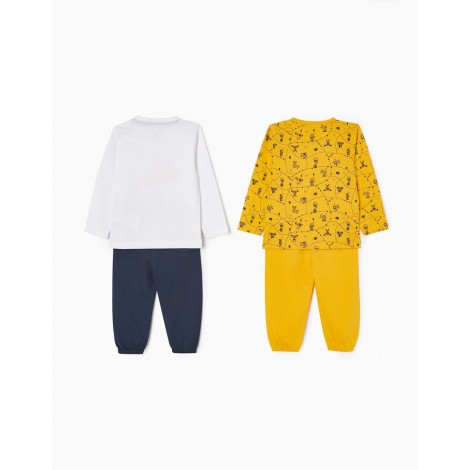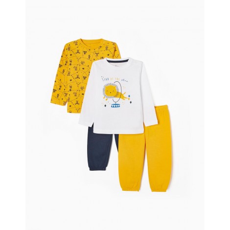 Confezione da due pigiami per neonato, nei toni del blu, bianco e giallo. Realizzata in jersey di cotone 100%. Include due t-shirt a maniche lunghe e due paia di pantaloni. Una t-shirt con stampa frontale, una con motivo stampato e due paia di pantaloni semplici con elastico in vita e fondo aderente. Collo a costine e bottoni automatici sulla spalla per una facile vestizione ed etichette interne stampate per non irritare la pelle. Una confezione pratica e simpatica, con l'etichetta Mix&Match, che permette di combinare i pezzi tra loro, creando pigiami diversi