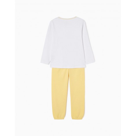 Pigiama bambina 100% cotone. Top bianco a maniche lunghe con scollo tondo e illustrazione frontale di un gattino in sella a una bicicletta. Pantalone giallo tinta unita, con elastico in vita e al fondo per una perfetta vestibilità. Etichette interne stampate per non irritare la pelle. Un pigiama morbido e confortevole con un'illustrazione divertente che le ragazze adoreranno.