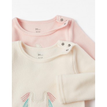 Confezione di quattro pezzi di pigiama per bambina, realizzato in tessuto polare, ideale per le notti più fresche. Comprende due maglie a maniche lunghe, una rosa e una bianca, con dettagli ricamati e stampe frontali di lama. Ha due bottoni a pressione sulla spalla per facilitare la vestizione. E due pantaloni, uno turchese e uno rosa, con vita e orli elastici per un maggiore comfort. Un pacchetto pigiama progettato per mescolare e abbinare i pezzi, creando più set pigiama.