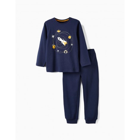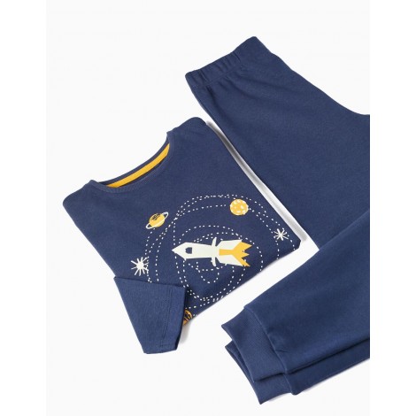Pigiama blu scuro per bambino, 100% cotone. T-shirt a maniche lunghe con stampa a tema spaziale sul davanti, con dettagli che si illuminano al buio. Pantaloni tinta unita con elastico in vita e polsini a coste. Etichette interne stampate per evitare irritazioni alla pelle.
