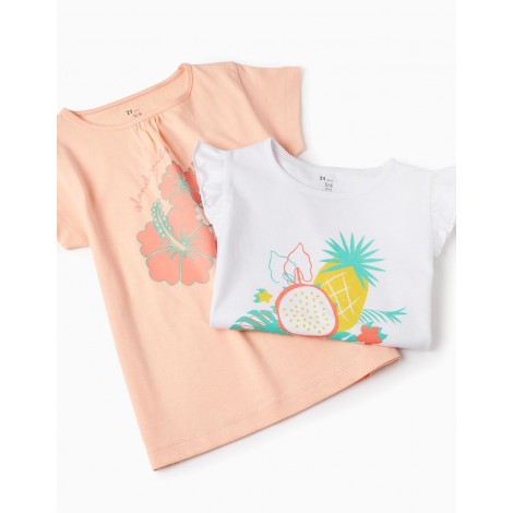 Set di due pigiami per bambina, 100% cotone. Include due magliette con stampa frontale, una bianca con volant senza maniche e una color corallo con maniche corte; e due pantaloncini semplici, uno verde acqua e uno corallo. Etichette interne stampate per non irritare la pelle. Una confezione di pigiami morbidi, comodi e mixabili.