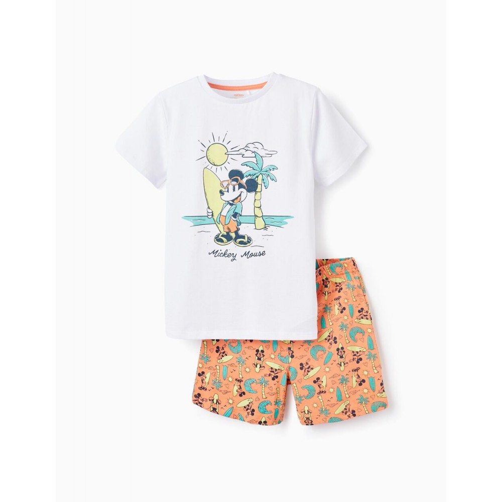 Pigiama due pezzi per bambino, 100% cotone. T-shirt bianca a maniche corte con bottoni automatici sulla spalla. Stampa frontale di Topolino in spiaggia. Pantaloncini arancioni con motivo Topolino, tavola da surf e varie illustrazioni a tema spiaggia. Cintura elastica per una migliore vestibilità.