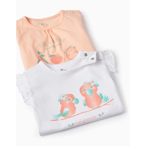Set di due pigiami per neonata, 100% cotone. Due top a maniche corte e due pantaloncini abbinati. Una t-shirt color pesca e una t-shirt bianca, entrambe con stampe tropicali sul davanti. La maglietta bianca include maniche arricciate. Entrambi con bottoni a pressione sulla spalla per una facile vestizione. Un paio di pantaloncini arancioni e un altro turchese, entrambi con elastico in vita per una migliore vestibilità e comfort. Etichette interne stampate per evitare irritazioni alla pelle. Un set di capi leggeri per un sonno confortevole nelle giornate più calde.