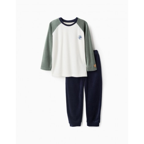Pigiama in ciniglia per bambini, nei toni del bianco, verde e blu. Realizzato in misto cotone. Maglia bianca e verde, con dettaglio di dinosauro stampato sul petto. Pantaloni blu scuro con polsini regolabili. Etichette interne stampate per non irritare la pelle. Con un cucciolo sollevato sul polso, così i bambini non si sentono mai soli di notte, promuovendo la loro autonomia. Un pigiama morbido e confortevole con il sigillo del club dei grandi ragazzi.