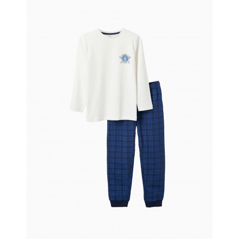 Pigiama due pezzi per bambini, 100% cotone. È composto da una maglietta a maniche lunghe con una piccola stampa sul petto; e un paio di pantaloni con una fantasia a quadri nei toni del blu. Con cintura e orli a costine per il massimo comfort. Etichette interne stampate per non irritare la pelle. Un pigiama comodo e morbido.