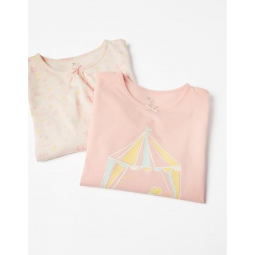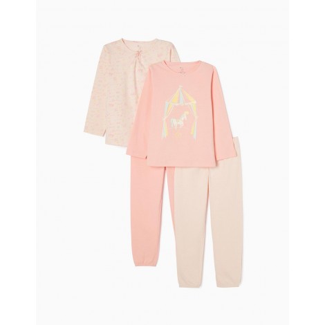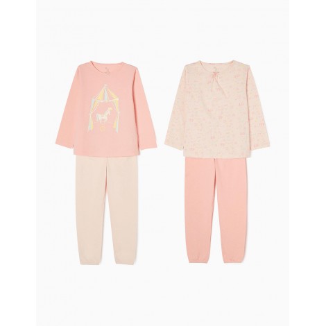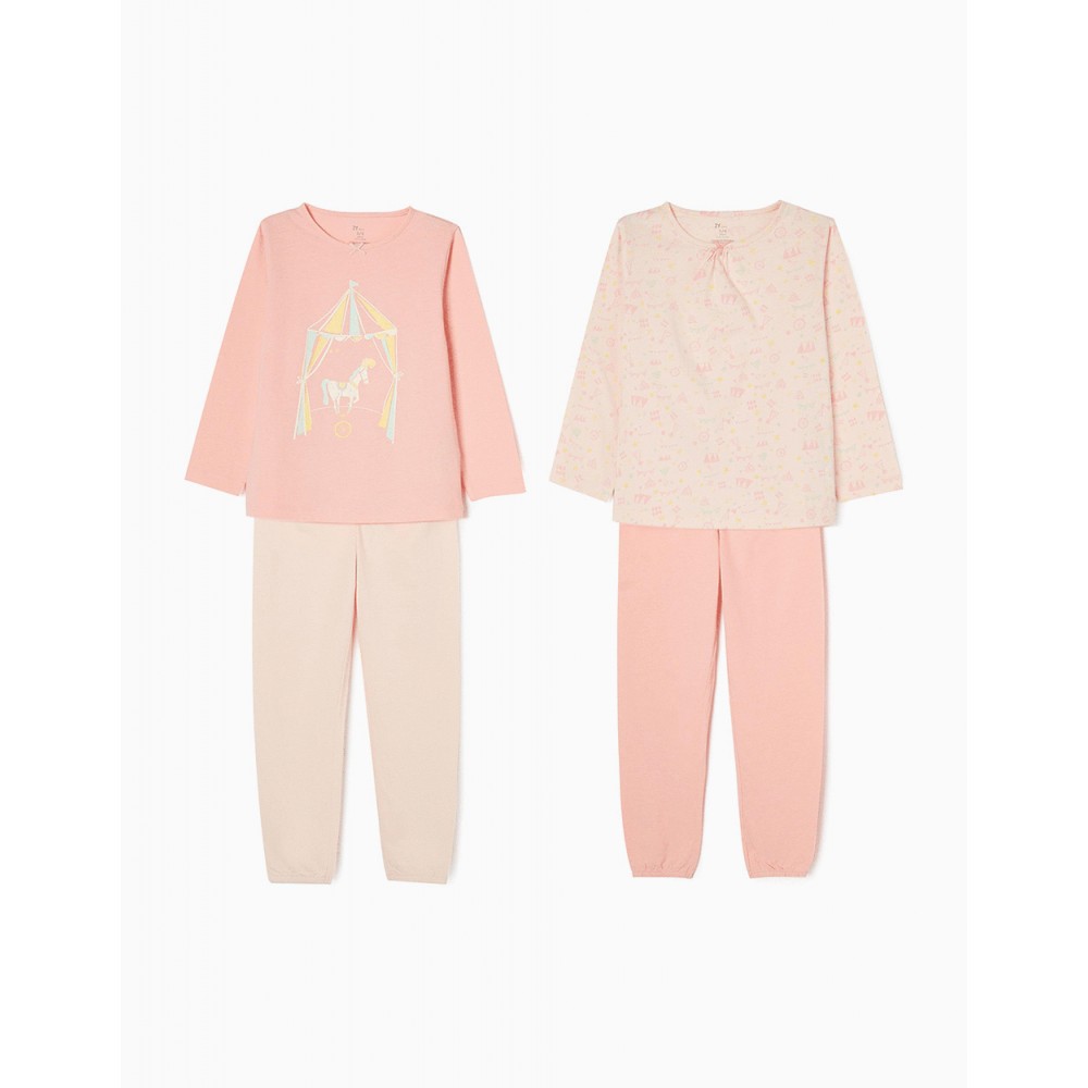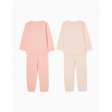 Confezione da due pigiami rosa per bambina, 100% cotone. Include due magliette a maniche lunghe e due paia di pantaloni. Una T-shirt con stampa frontale e una con motivo stampato, entrambe con fiocco al colletto e taglio fluido. Due paia di pantaloni semplici con elastico in vita e orli. Etichette interne stampate per non irritare la pelle. Una confezione pratica e simpatica, con l'etichetta Mix&Match, che permette di combinare i pezzi tra loro, creando pigiami diversi.