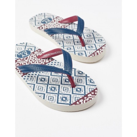 Infradito per bambini, con fantasia tribale, nei toni del bianco, del blu scuro e del bordeaux. Suola antiscivolo. Sono leggeri, comodi e facili da pulire, perfetti per le stagioni più calde.
