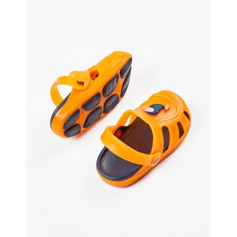 Sandali arancioni per neonato, flessibili e molto comodi. Applicazione pellicano in gomma sulla parte superiore. Cinturino mobile, quindi può essere utilizzato come sandali o zoccoli. Sottopiede dalla forma esclusiva, estraibile e lavabile. Suole antiscivolo. Linea speciale di scarpe 'ZY Delicious', con elementi profumati.