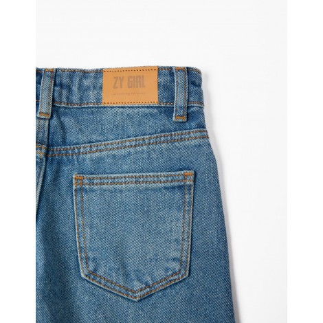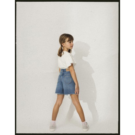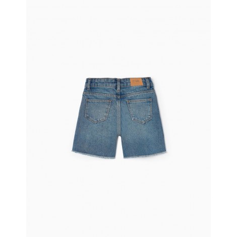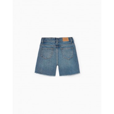 Shorts in denim blu per bambina, realizzati in denim 100% cotone. Patta con cerniera con bottone a pressione per vestirsi facilmente. Quattro tasche. Girovita interno regolabile con bottoni ed elastici. Orli sfilacciati. Taglio ampio e svasato. Un capo comodo e intramontabile, ideale da indossare con top e t-shirt.