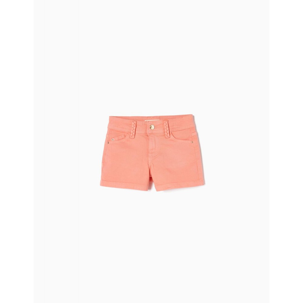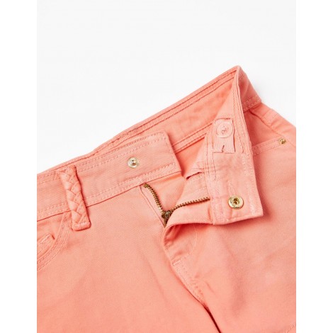Shorts in twill corallo per bambina, in cotone elasticizzato per maggiore comfort e libertà di movimento. Girovita interno regolabile con bottoni ed elastici. Cinque tasche. Finiture intrecciate. Un capo moderno e casual, perfetto per outfit primaverili ed estivi. Big Me: chiusura con bottoni a pressione fino alla taglia 5/6 per vestirsi facilmente e favorire l'autonomia dei bambini.