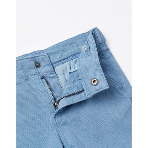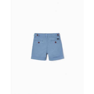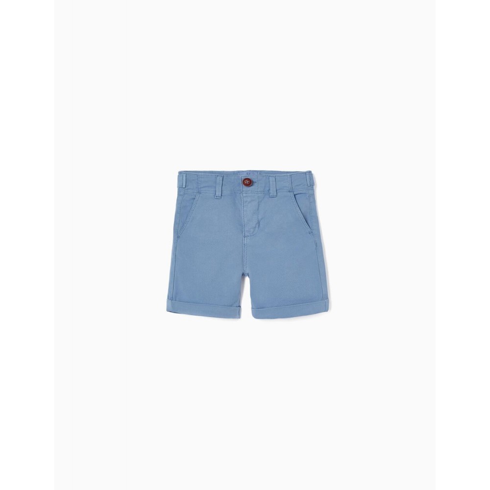 Pantaloncino blu per neonato, realizzato in dobby di cotone elasticizzato per maggiore comfort e libertà di movimento. Vita regolabile all'interno con elastico e bottoni. Due tasche anteriori e due posteriori con bottoni. Si chiude sul davanti con bottone a pressione e zip per vestirsi facilmente. Tinto in capo. Pantaloncini super comodi ed eleganti per ogni occasione.