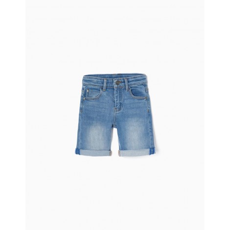 Shorts midi blu per bambino, in denim di cotone con un tocco di stretch per maggiore comfort e libertà di movimento. Cinque tasche. Si chiude con una cerniera e bottoni a pressione sul davanti per vestirsi facilmente. Pieghe agli orli. Pantaloncini indispensabili per le calde giornate estive. Big Me: chiusura con bottone automatico sotto un bottone decorativo fino alla taglia 5/6 per vestirsi facilmente e favorire l'autonomia dei bambini.