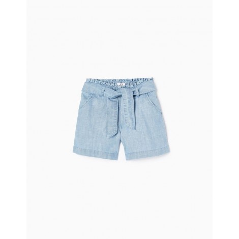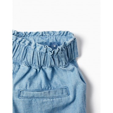 Shorts in vita stile paperbag blu per bambina, realizzati in tessuto denim blu 100% cotone. Due tasche laterali e una tasca decorativa sul retro. Nastri incorporati per annodare davanti. Un paio di pantaloncini comodi, casual e informali.