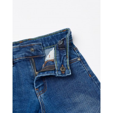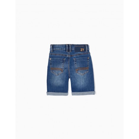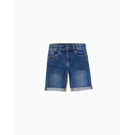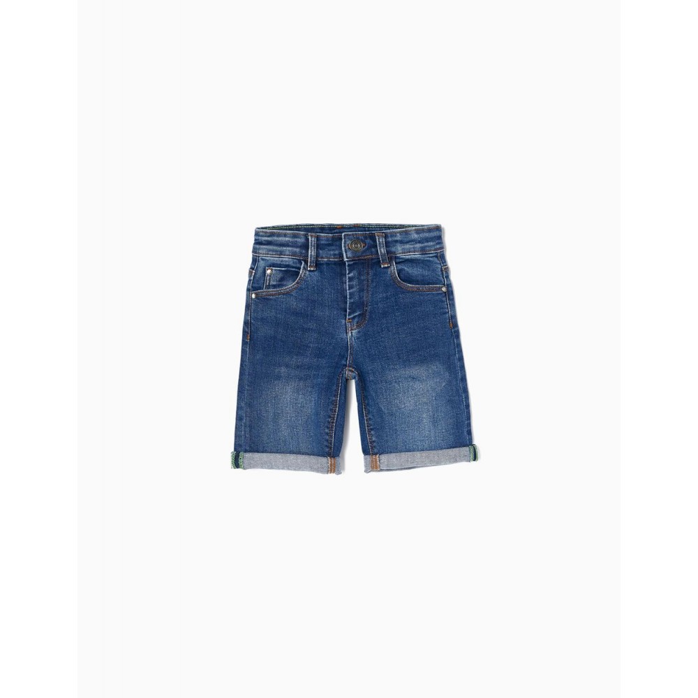 Shorts midi blu scuro per bambino, in denim di cotone con un tocco di stretch per maggiore comfort e libertà di movimento. Cinque tasche. Si chiude sul davanti con zip e bottoni a pressione per vestirsi facilmente. Pieghe agli orli. Un paio di pantaloncini indispensabili per le calde giornate estive. Big Me: chiusura con bottone automatico sotto un bottone decorativo fino alla taglia 5/6 per vestirsi facilmente e favorire l'autonomia dei bambini.