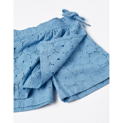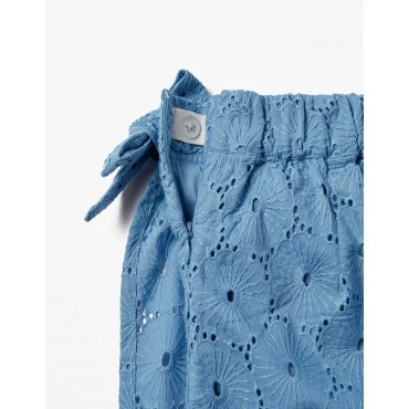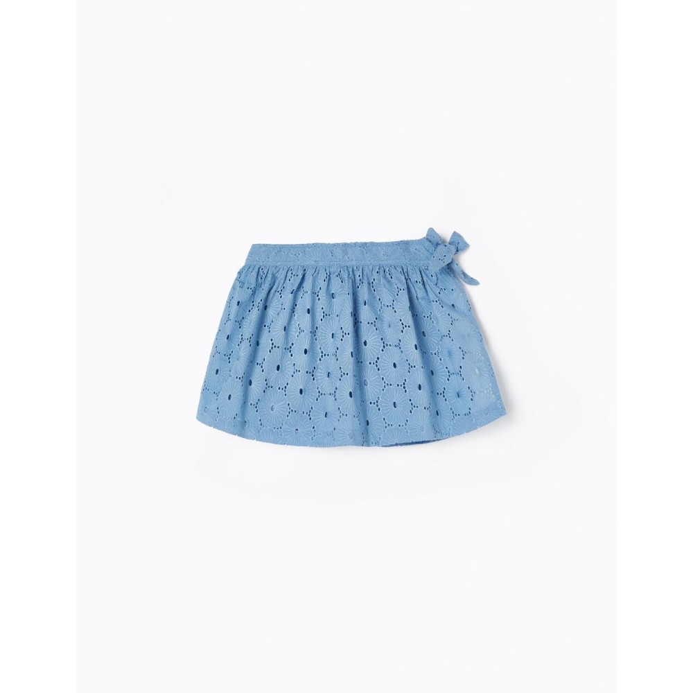 Gonna blu per bambina, 100% cotone. Ricamo inglese con motivo floreale. Vita elasticizzata e zip laterale per vestirsi facilmente. Regolabile all'interno con elastico e bottoni. Con fodera per un maggiore comfort. Un capo di mezza stagione divertente ed essenziale.