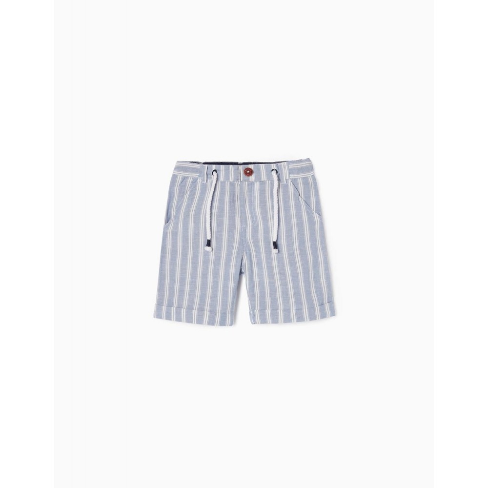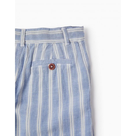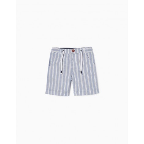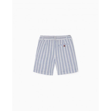 Shorts a righe per bambino, nei toni del bianco e del blu, realizzati in misto viscosa, cotone e lino. Tre tasche. Chiusura con bottone e coulisse. Girovita interno regolabile con bottoni ed elastici. Un capo leggero e comodo, adatto a tutti gli stili.