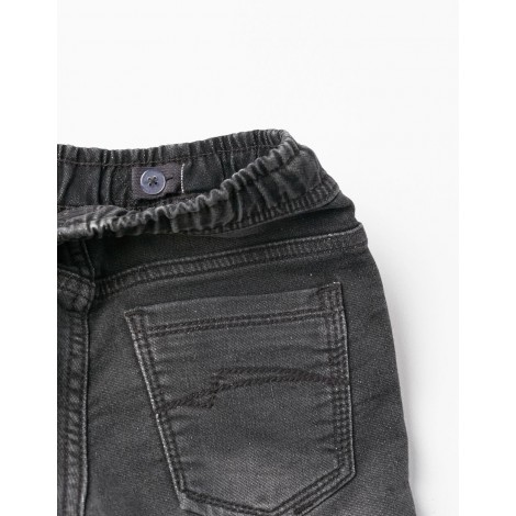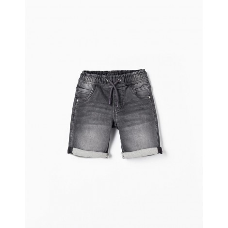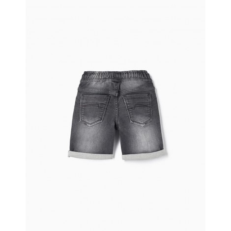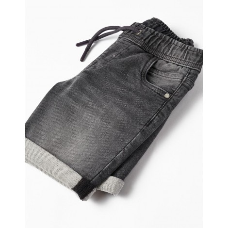 Pantaloncini grigio scuro per ragazzi in denim misto cotone con un tocco di elastan per maggiore comfort e libertà di movimento. Modello sportivo dal taglio midi. Due tasche frontali e due tasche posteriori. Vita elastica con bottoni ed elastici regolabili nella parte interna e con coulisse in contrasto nella parte esterna