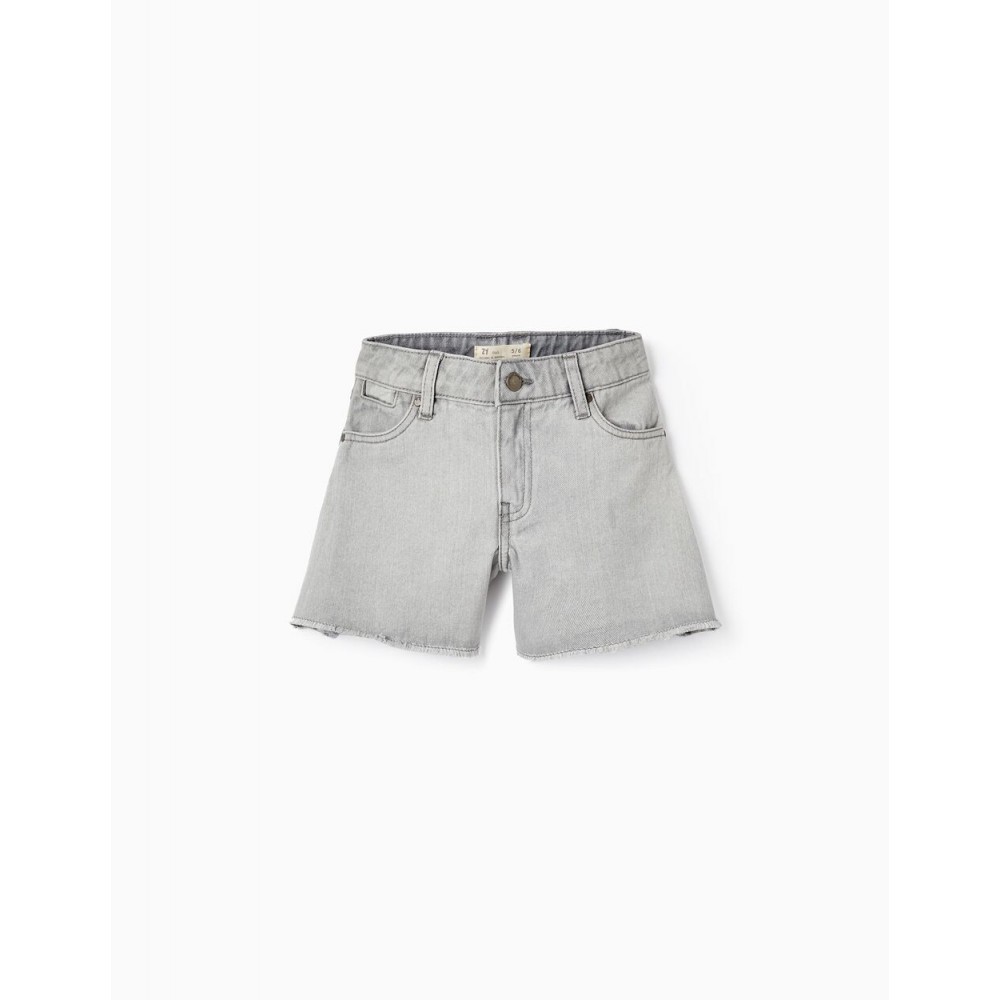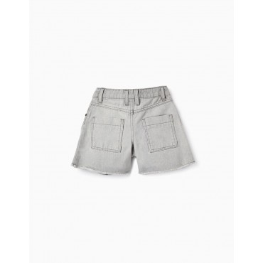Shorts grigi per bambina, realizzati in denim 100% cotone. Vita con elastici e bottoni regolabili all'interno. Cinque tasche. Rifinitura dell'orlo con fili. Big Me: si chiude con un bottone a pressione sotto un bottone decorativo fino alla taglia 8/9, per facilitare la vestizione e favorire l'autonomia del bambino.
