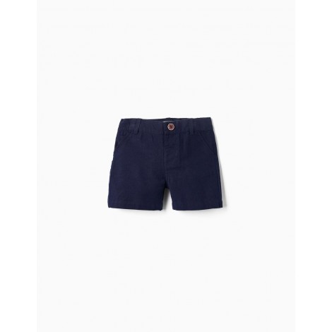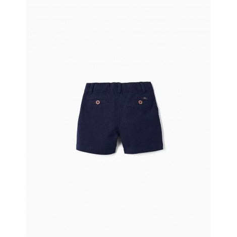 Pantaloncini chino blu scuro per neonato in misto cotone e lino. Vita con elastico e bottoni all'interno per una migliore vestibilità. Si chiude sul davanti con un bottone a pressione. Cinque tasche, tre decorative e due funzionali sul davanti. Shorts comodi e pratici che possono completare diversi look quotidiani.