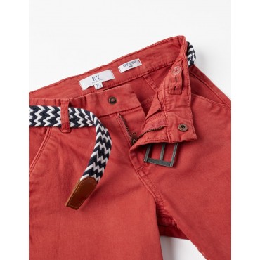 Pantaloncini color mattone per ragazzi con cintura a contrasto bianca e blu scuro. Shorts in cotone con un tocco di elastan per maggiore comfort e libertà di movimento. Quattro tasche. I pantaloncini si chiudono sul davanti con un bottone a pressione e una cerniera. Big Me: si chiude con un bottone a pressione sotto un bottone decorativo fino alla taglia 8/9, per facilitare la vestizione e favorire l'autonomia del bambino.