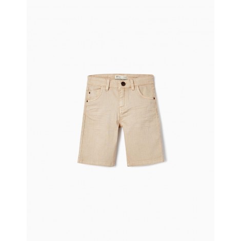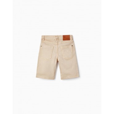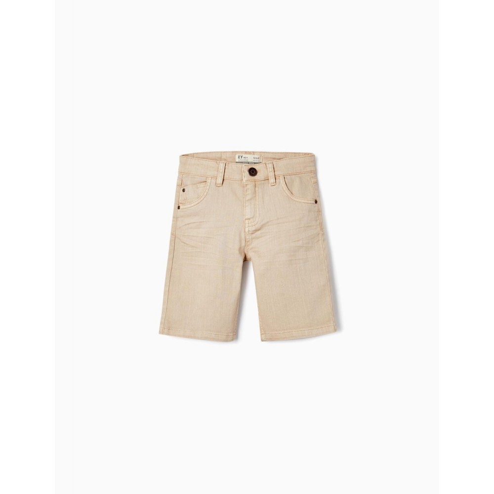 Pantaloncini beige per ragazzi in twill di cotone con un tocco di elasticità. Modello medio. Cinque tasche. Si chiude sul davanti con un bottone a pressione e cerniera. Big Me: si chiude con un bottone a pressione sotto un bottone decorativo fino alla taglia 8/9, per facilitare la vestizione e favorire l'autonomia del bambino.