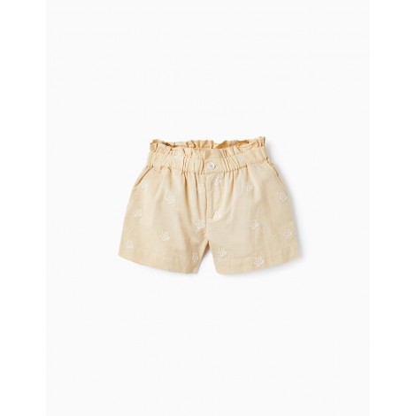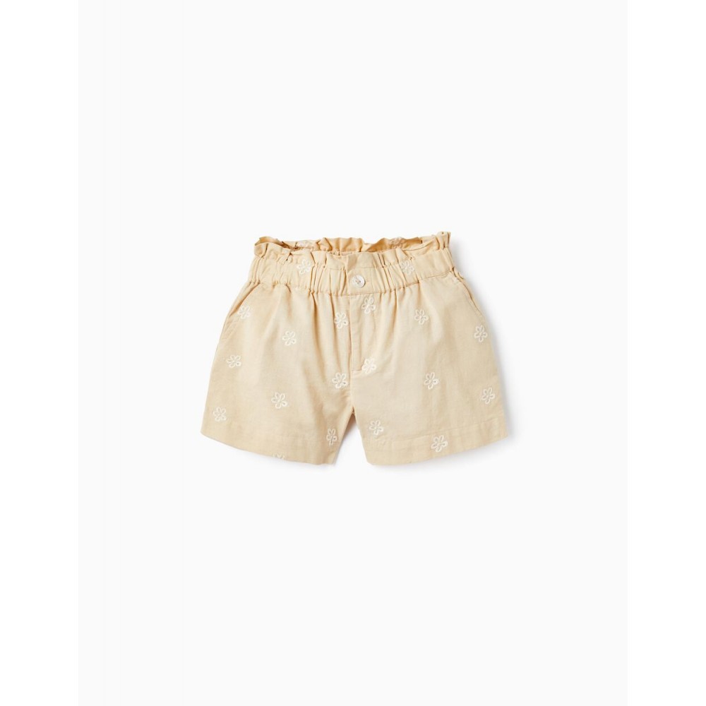 Shorts beige per bambina, realizzati in misto cotone e lino, con ricami di fiori bianchi in rilievo. Quattro tasche. Cintura elastica con volant, regolabile all'interno con elastici e bottoni. Si chiude con un bottone e una cerniera. Un capo leggero e comodo, per ogni occasione. We Care: articolo con certificazione Oeko-Tex Standard 100, che garantisce l'assenza di sostanze nocive o irritanti per la pelle.