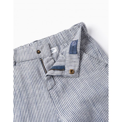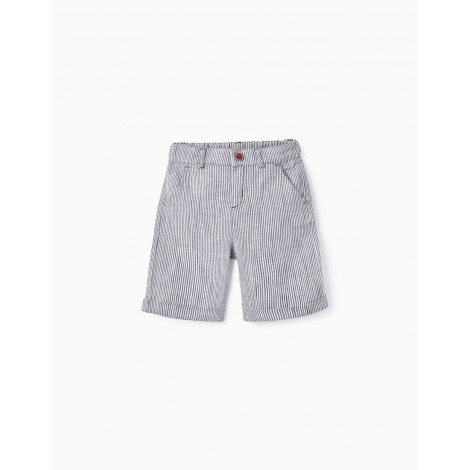 Shorts a righe bianche e blu scuro per bambino, realizzati in un morbido misto di cotone e lino. Quattro tasche. Vita regolabile internamente con elastici e bottoni. Perfetto per ogni occasione, sia per l'uso quotidiano che per le occasioni speciali. Big Me: si chiude con un bottone a pressione sotto un bottone decorativo fino alla taglia 8/9, per facilitare la vestizione e favorire l'autonomia del bambino.