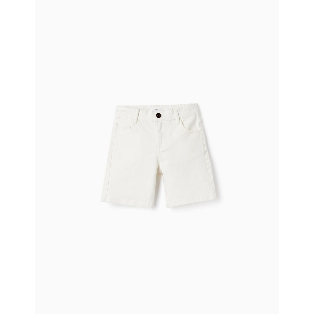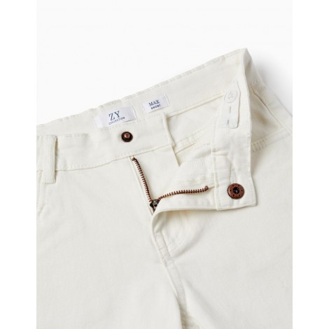 Shorts bianchi per bambino, in twill di cotone con un tocco di elasticità per maggiore comfort e libertà di movimento. Vita regolabile con elastici e bottoni. Quattro tasche. Tinto in capo. Un capo intramontabile e classico, perfetto per ogni occasione. Big Me: chiusura con bottone automatico sotto un bottone decorativo fino alla taglia 8/9 per vestirsi facilmente e favorire l'autonomia dei bambini.