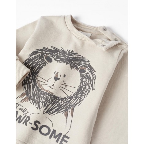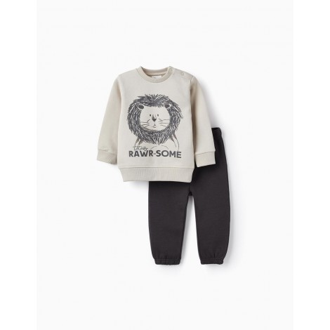 Tuta da neonato, realizzata in misto cotone. Interno in cotone felpato per il comfort termico. Include una felpa beige con stampa frontale, bottoni automatici sulla spalla per indossarla facilmente e polsini a coste per una migliore vestibilità e comfort. Pantaloni grigio scuro con vita elastica e regolabile con coulisse a contrasto. Polsini elasticizzati per una migliore vestibilità. We Care: Articolo certificato Oeko-Tex Standard 100, che garantisce l'assenza di sostanze nocive o irritanti per la pelle. Un set pratico e confortevole, ideale da indossare tutti i giorni.