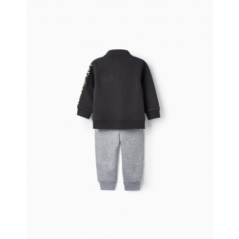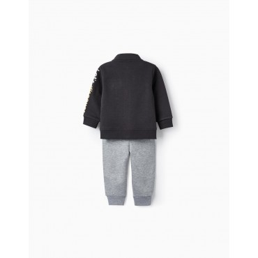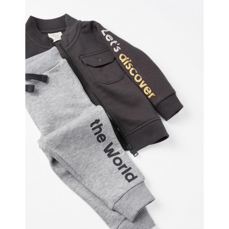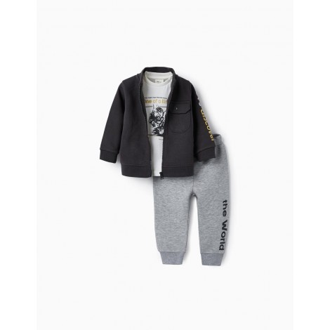 Set di tre pezzi per maschietto, in misto cotone. Giacca in pile grigio scuro con cappuccio, interno garzato, stampa sul davanti e sulla manica, apertura con zip, tre tasche frontali - due ai lati e una sul petto con bottone automatico - e polsini e fondo a costine per una buona vestibilità. T-shirt bianca a maniche lunghe, 100% cotone, con stampa frontale e apertura con bottone automatico sulla spalla per indossarla facilmente. Joggers grigio chiaro con interno spazzolato, stampa frontale, vita e orlo a costine e coulisse regolabile per una vestibilità perfetta. We Care: articolo con certificazione Oeko-Tex Standard 100, che garantisce l'assenza di sostanze nocive o irritanti per la pelle. Un set pratico, comodo e caldo per le avventure dei più piccoli.